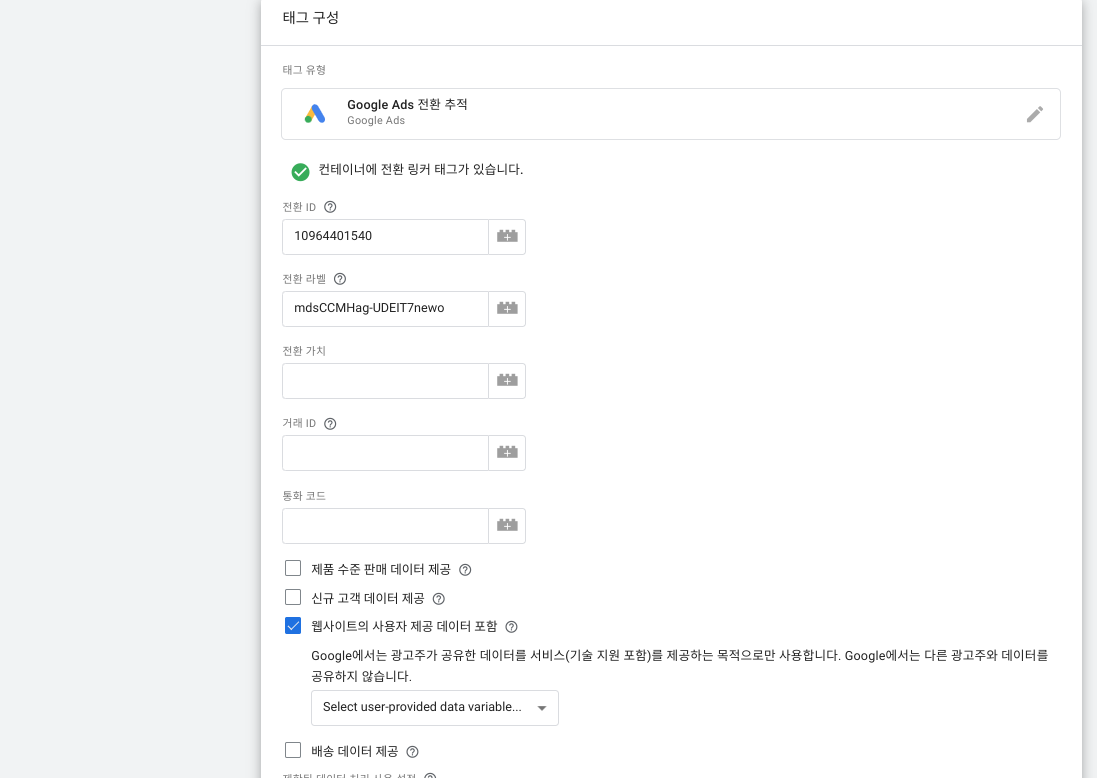 먼저 글로벌태그에 향상된 전환 옵션을 추가합니다. 이때, 'TAG_ID'는 해당하는 구글애즈계정 아이디로 변경합니다.