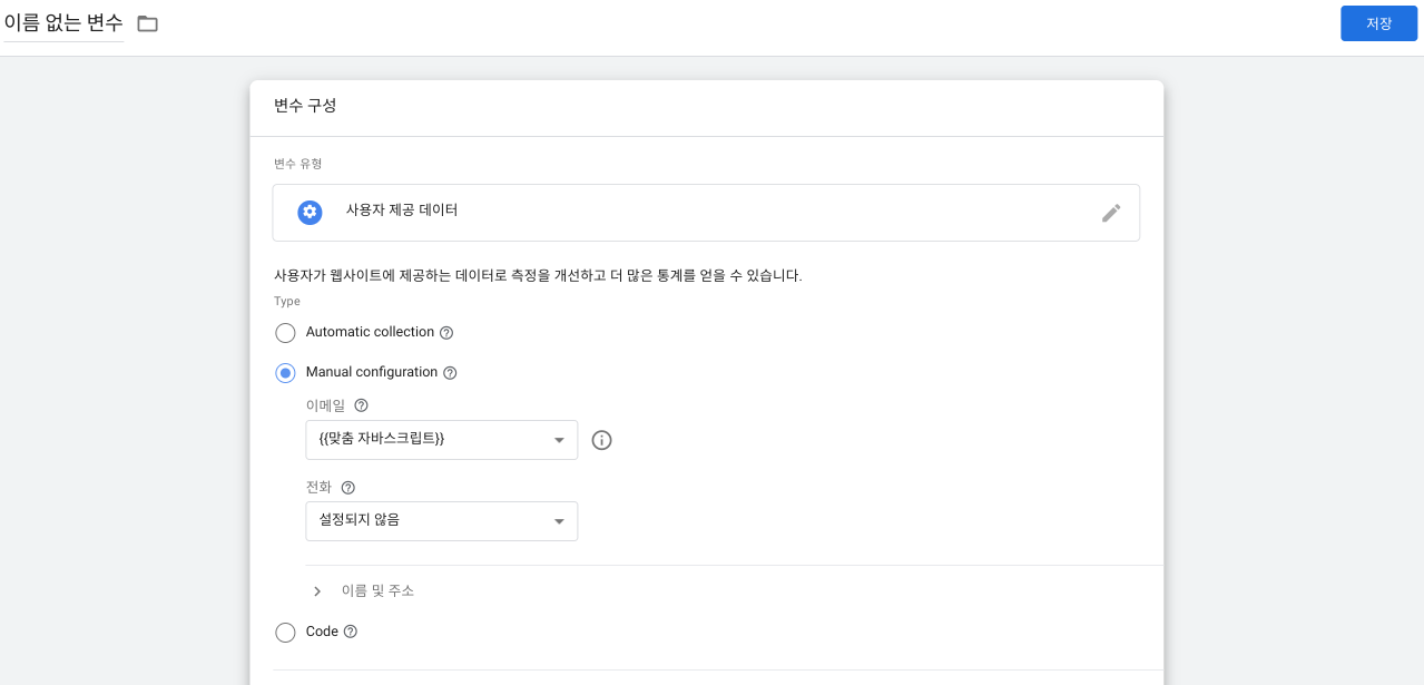 사이트에 삽입된 구글 태그 관리자 태그가 인지되면 아래와 같은 화면이 뜨는데요. 우측에 '저장' 선택