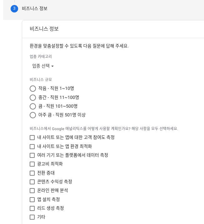 다음으로 비즈니스 정보가 뜨는데요. 입력은 선택사항이나 속성 생성 후 수정이나 추가는 불가합니다. (부가 정보로 데이터 수집에 많은 영향을 주지는 않음으로 생략 가능)