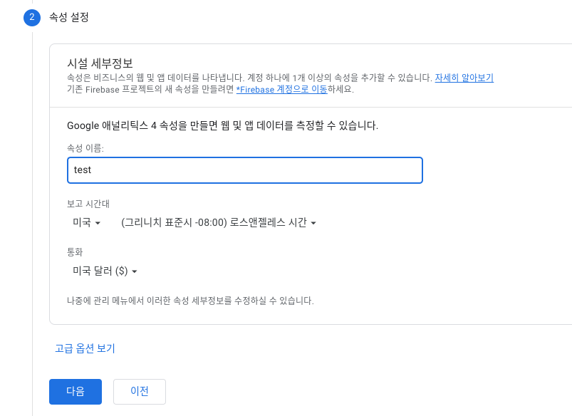 다음은 속성 설정인데요, '속성 이름' -> 웹사이트를 운영하는 곳에 따라 '보고 시간대' 및 '통화' 선택 후 '다음' 선택 (한 속성은 하나의 데이터 스트림을 가짐)