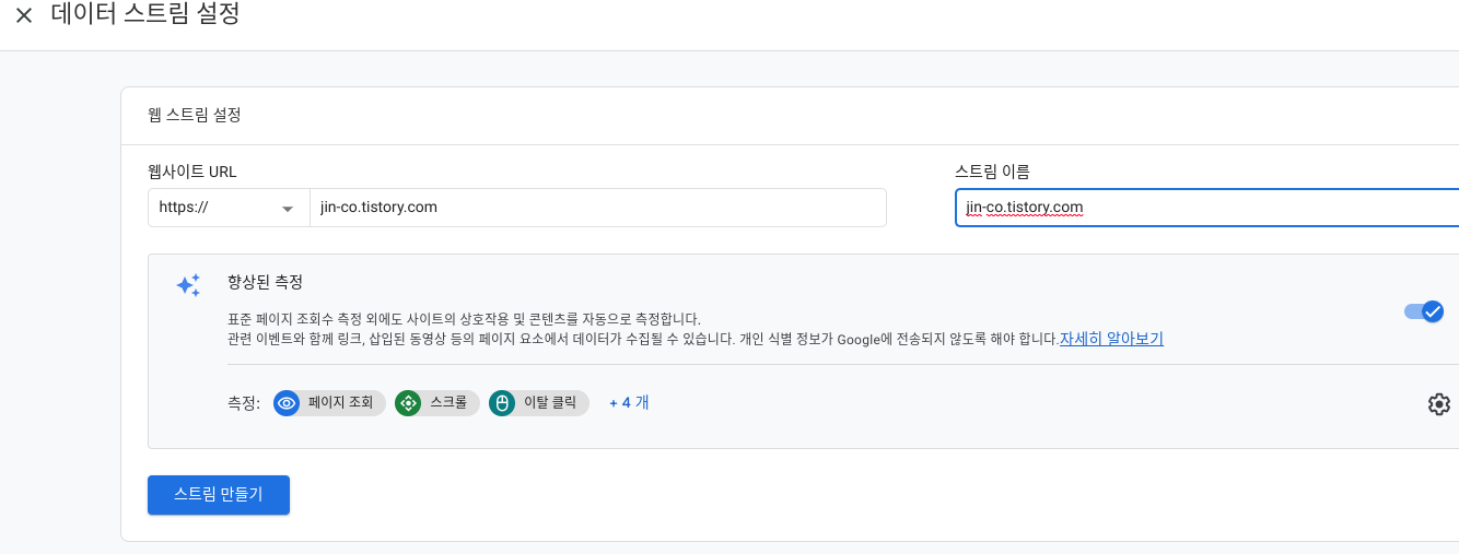 그리고 데이터 스트림 설정 화면에서 웹사이트 도메인과 스트림 이름을 넣은 후 '스트림 만들기'를 선택합니다.