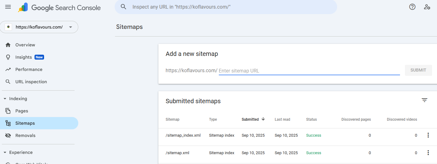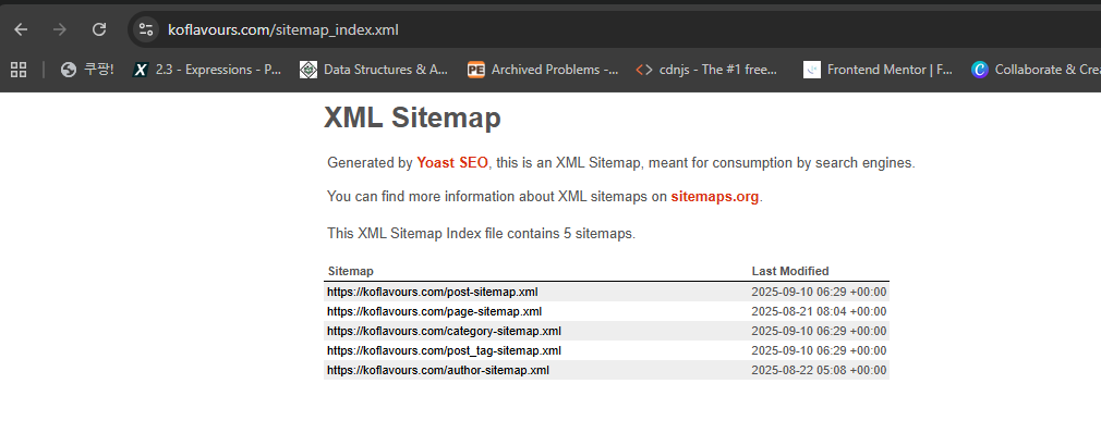koflavours.com):https://koflavours.com/sitemap.xml또는https://koflavours.com/sitemap_index.xml을 제출하시면 됩니다.