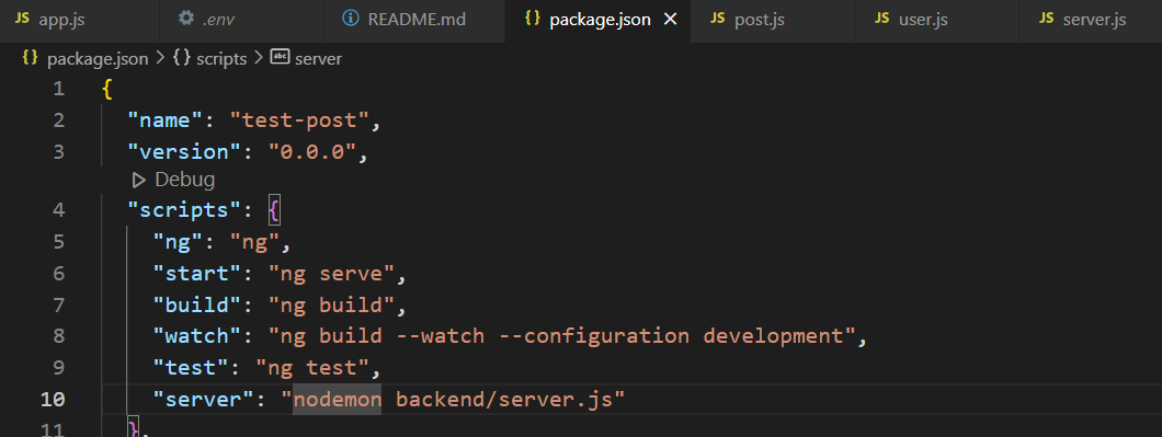 package.json파일을 열고 스크립트 칸에 노드몬 커맨드 추가