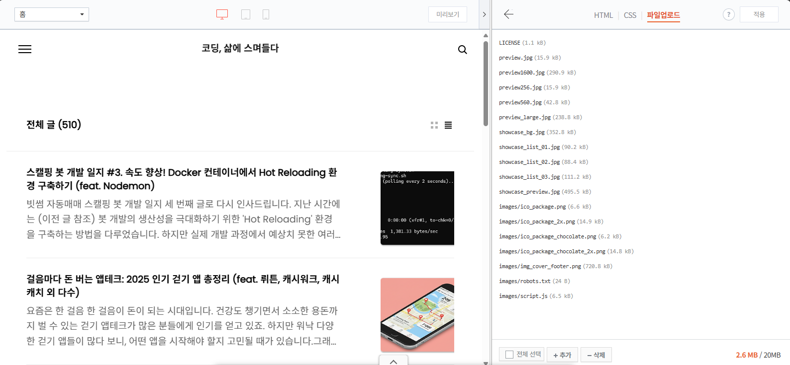 - 파일 업로드 탭 선택: HTML/CSS 편집 화면에서 '파일 업로드' 탭을 선택합니다.