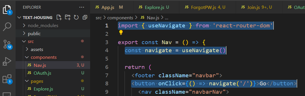 내비게이션 컴포넌트로 이동하여 아래와 'useNavigate'를 불러오고