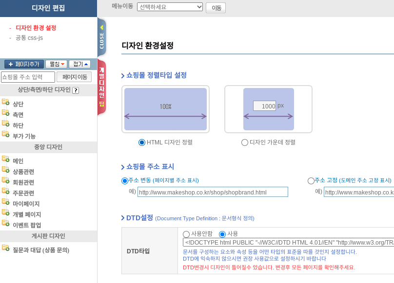 관리자 로그인 상단에 '개별 디자인' -> 좌측에 '디자인 스킨 관리' -> '디자인 편집하기' 순으로 누름