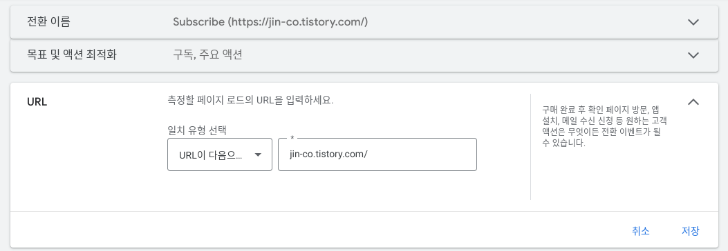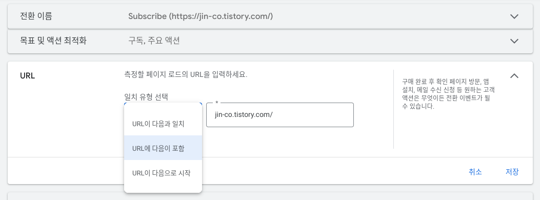 전환이 발생하는 페이지의 주소가 우측에 입력된 주소를 포함하면 전환이 발생합니다.