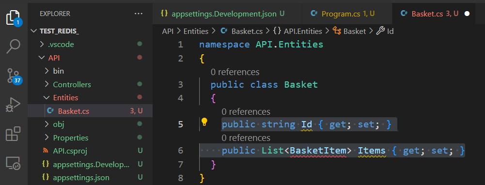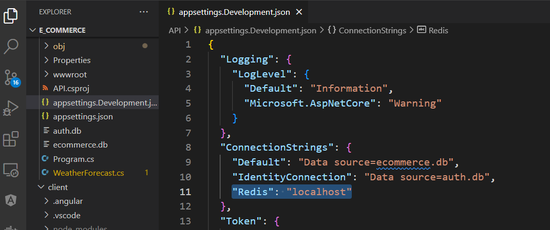 환경변수 활용을 위해 appsettings 파일을 열고 리디스 연결문을 생성합니다