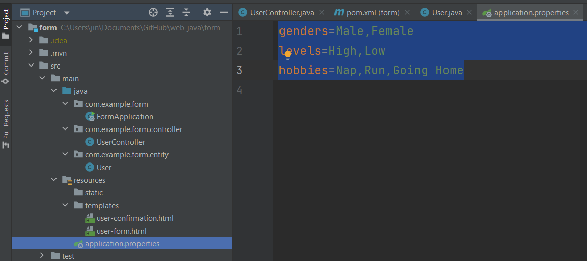 Select나 Radio처럼 다수의 항목이 값으로 사용되는 경우 application.properties 파일에 환경변수를 설정하고 설정된 변수를 폼 필드에 주입하는 것도 가능합니다.