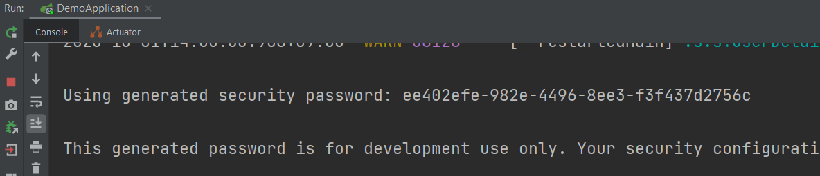 디펜던시를 pom.xml 파일에 추가 후 앱을 가동하면 콘솔에 아래처럼 생성된 비밀번호가 뜹니다.