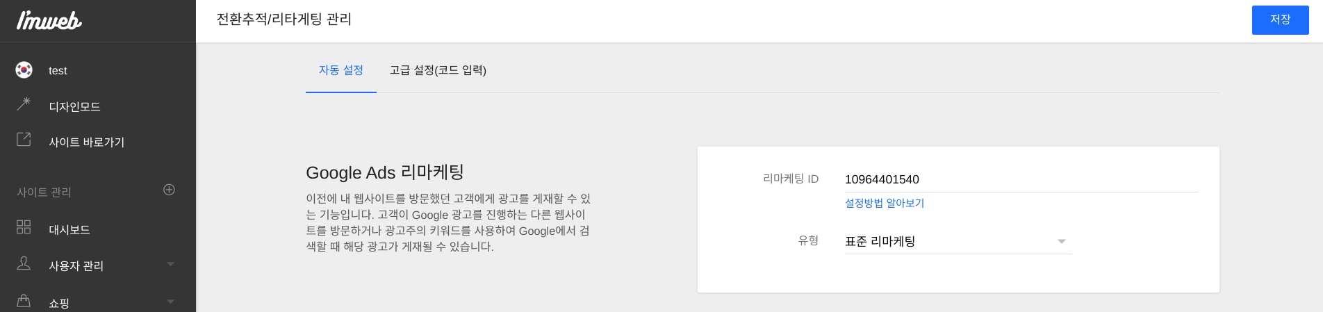 아래와 같이 리마케팅 아이디 칸에 'AW-'를 제외한 숫자만 입력합니다.