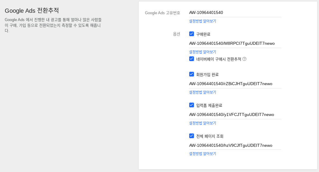 사용하고자 하는 전환을 체크하고 'AW-' 아이디와 라벨값이 포함된 전환 아이디를 입력합니다.