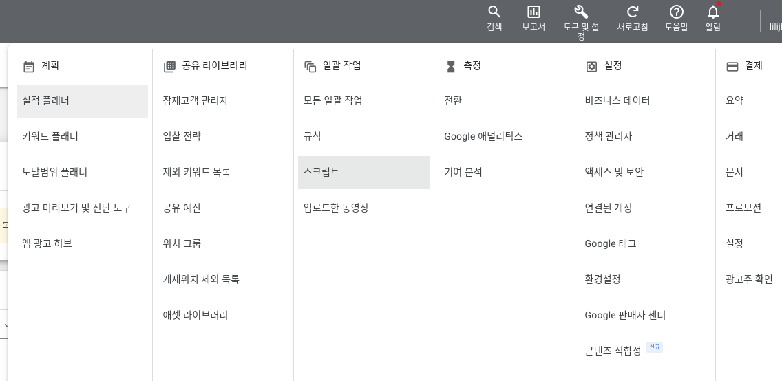 애즈 계정에서 상단메뉴에 '도구 및 설정' -> '전환' 선택