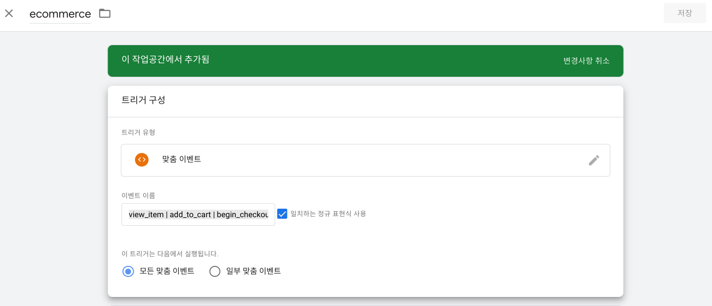 '이벤트 이름' 항목에 넣은 후 '일치하는 정규 표현식 사용'을 체크하고 저장합니다.