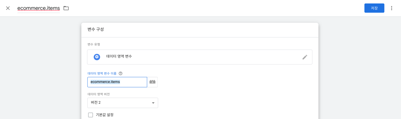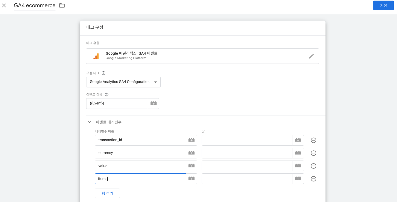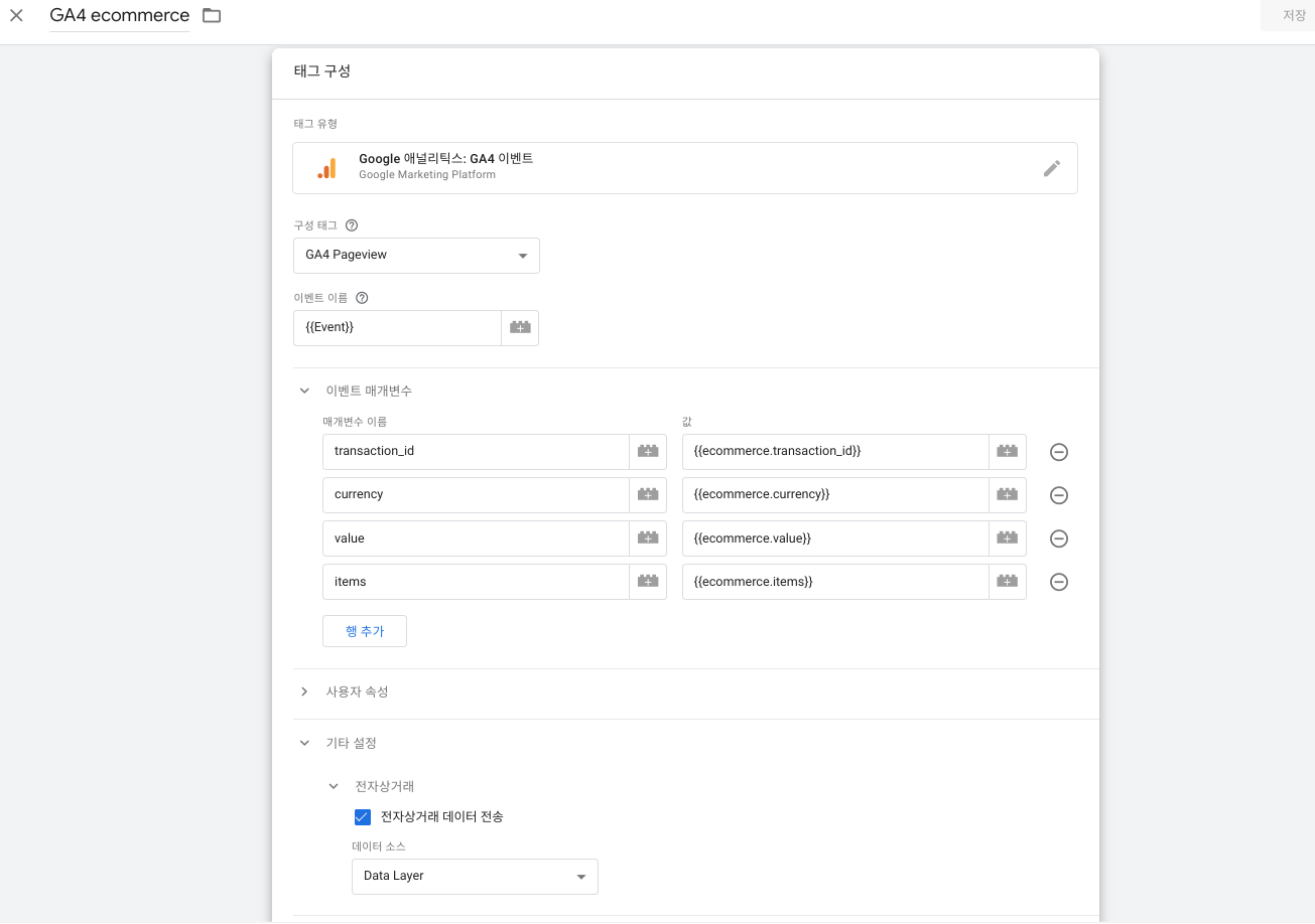 다음으로 매개 변수이름을 ecommerce 데이터레이어에 추가한 변수명에 맞게 추가합니다.