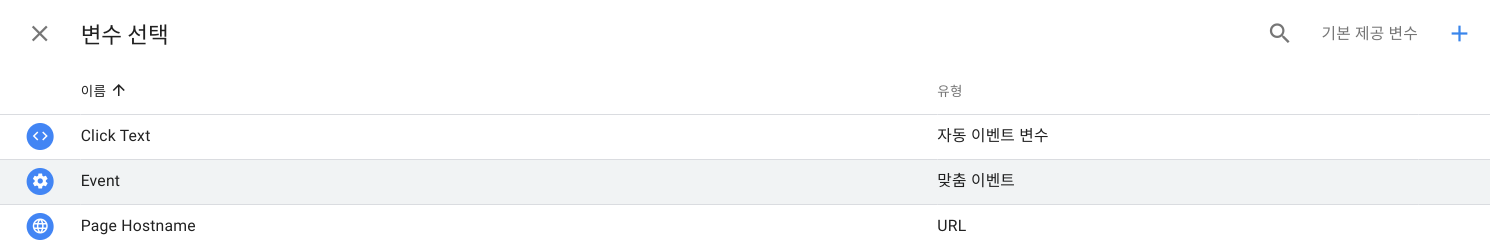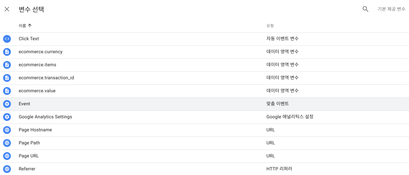 태그관리자 구현된 코드 목록