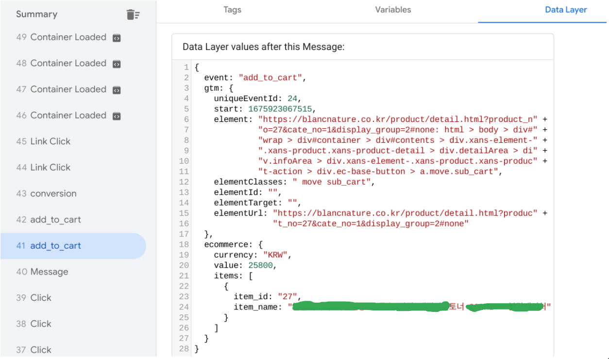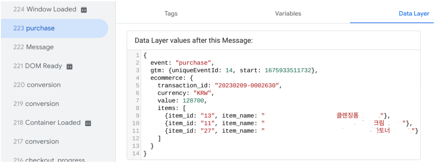 ※ 데이터레이어 정보를 참고하는 변수 이름 지정. 객체 하위에 값은 '.'으로 접근 가능합니다.