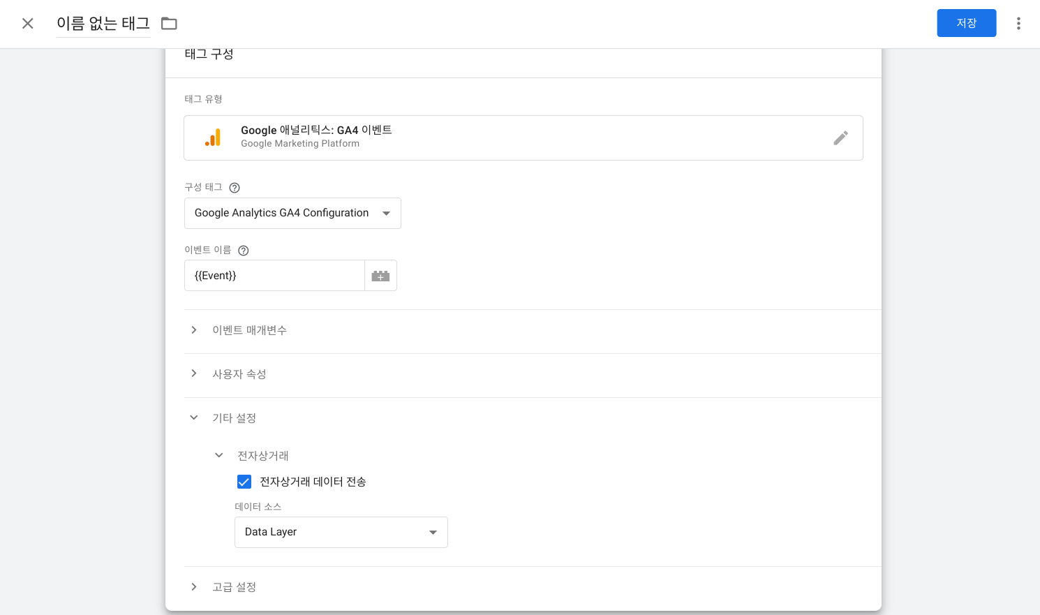'기타 설정'을 열고 '전자상거래 데이터 전송' 박스를 체크합니다 (소스는 Data Layer설정 그대로 유지).
