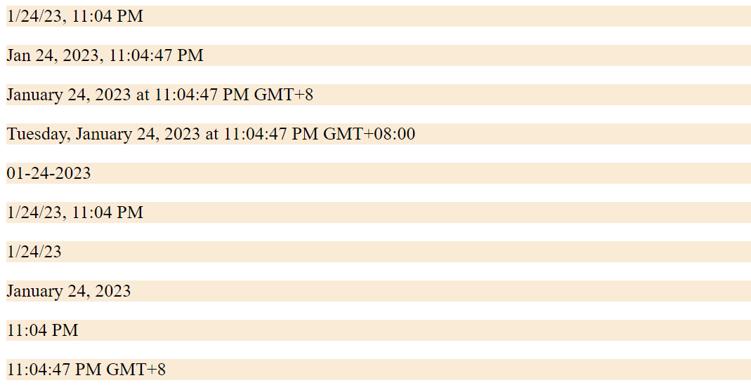 | 'medium' | 'MMM d, y, h:mm:ss a' | Jun 15, 2015, 9:03:01 AM |