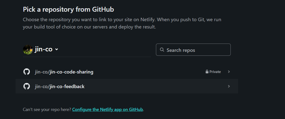 원하는 레포를 선택하는 화면이 나오는데, 원하는 레포가 보이지 않는 경우 'Configure the Netlify app on GitHub' 버튼을 누릅니다.