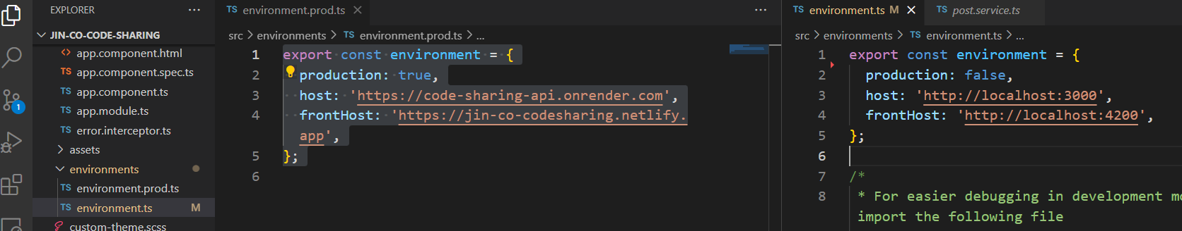 먼저, Front 쪽에서 서버로 요청할 때 개발환경에서 부르는 주소와 배포된 환경에서 부르는 주소가 달라야겠죠. 이는 앵귤러에서 제공하는 API 설정파일인 environment파일을 통해 가능합니다.