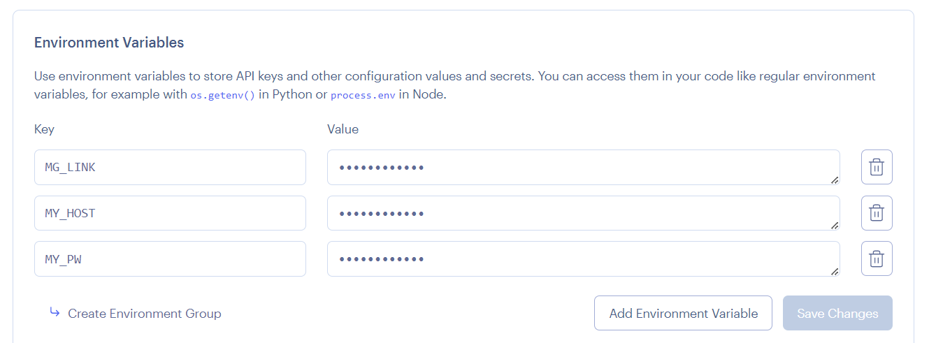 ※ .env를 사용하여 환경변수를 사용하는 경우 해당 환경변수의 명과 값도 지정해 줍니다. 지정은 변수명 또는