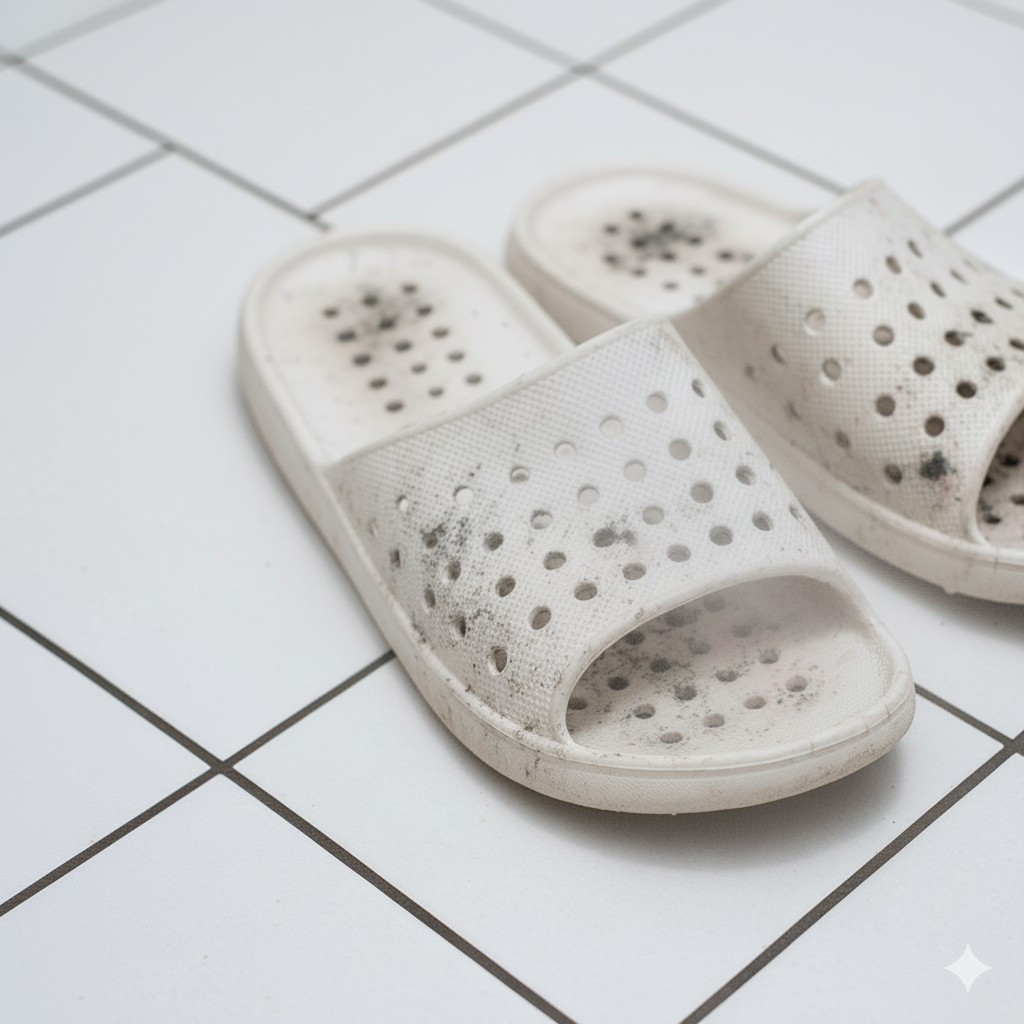 - 목표물 설정: 욕실 슬리퍼에 시커멬게 앉은 물때나 곰팡이 부분을 확인합니다. 주로 슬리퍼의 바닥면, 물 빠짐 구멍 주변이 심할 거예요.