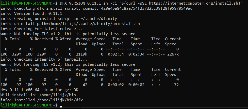 DFX_VERSION=0.11.1 sh -ci "$(curl -sSL https://internetcomputer.org/install.sh)"
