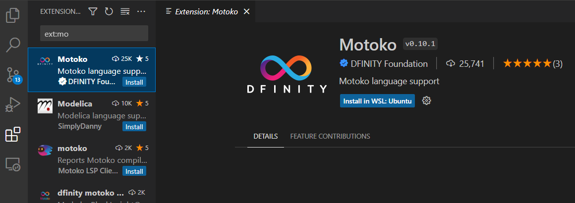 익스텐션 메뉴에서 motoko를 검색 (src 아래 토큰파일인 .mo 파일의 코드 컬러라이저 익스텐션)