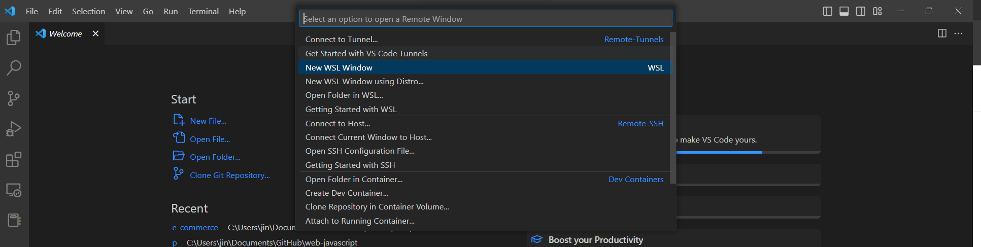 비주얼 스튜디오 코드를 열고 좌측하단에 리모트 창 열기 아이콘을 선택합니다.