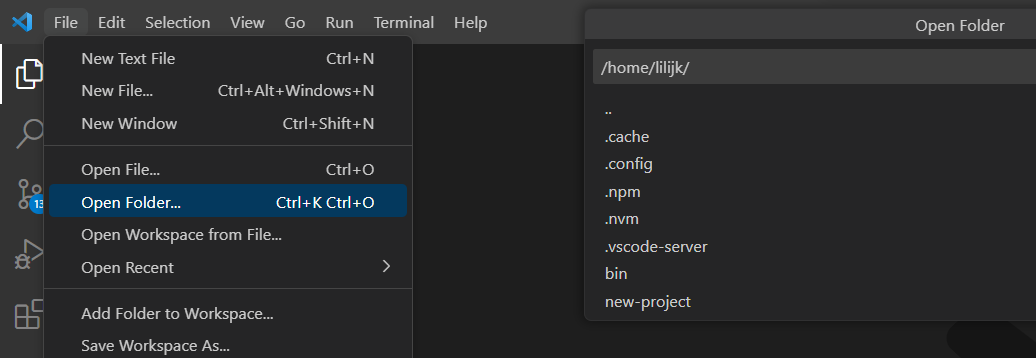 'File' -> 'Open Folder' 선택 후 검색창에서 생성된 애플리케이셔 이름 선택