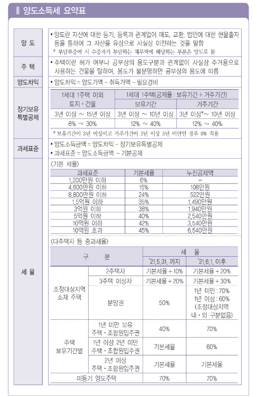 다만, 1세대 1 주택의 경우 보유기간이 2년 이상이고 고가주택에 해당하지 않는 경우 비과세. 취득 당시 조정지역에 해당하는 주택의 경우 보유기간 중 2년 이상 거주한 경우만 비과세 (단, 민간임대주택 사업자로 등록한 경우 거주요건 불필요)