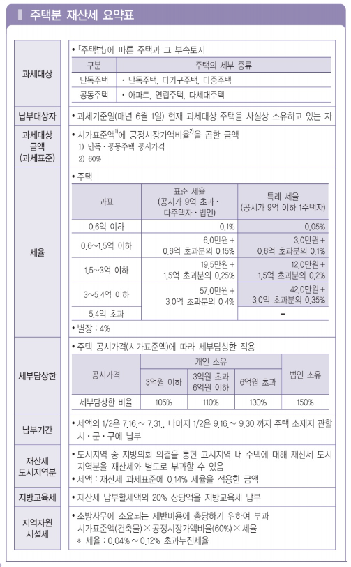재산세는 토지, 건축물, 주택 등에 부과되는 지방세로 주택에 부과하는 재산세를 주택재산세라 한다. 주택은 그 부속토지를 포함, 등기가 되지 않은 무허가 건물에도 과세됨. 오피스텔은 건축물과 과세되는 것이 원칙이나 주거용으로 사용하는 경우 납세자의 신청에 의해 주택으로 과세