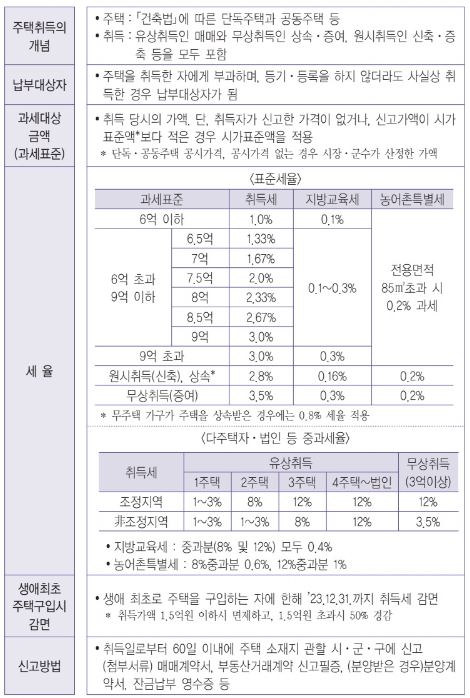 - 중과세율: 다주택자 다주택 산정 시 시가표준액 1억 원 이하인 주택과 농어촌주택 등은 중과세에서 제외되어 1% ~ 3%의 표준세율 적용. 법인인 경우 12% 세율. 조정지역 내 시가표준액이 3억 원 이상인 주택 무상취득(상속취득 제외) 시 12% 세율. 시가표준액 9억 원을 초과하는 고급주택 취득 시 표준세율에 8% 세율 가중