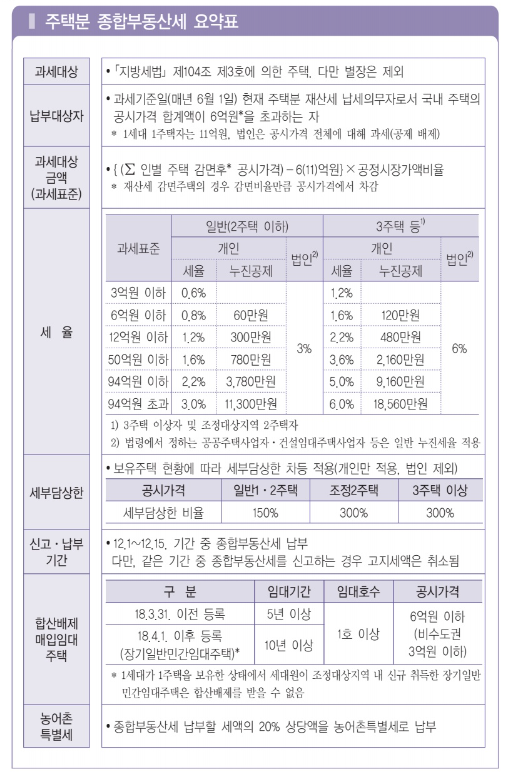 과세대상: 과세기준일(6월 1일) 현재 재산세 납세의무자로 국내에 소유한 주택의 공시가격 합계가 6억 원 초과 시 부과