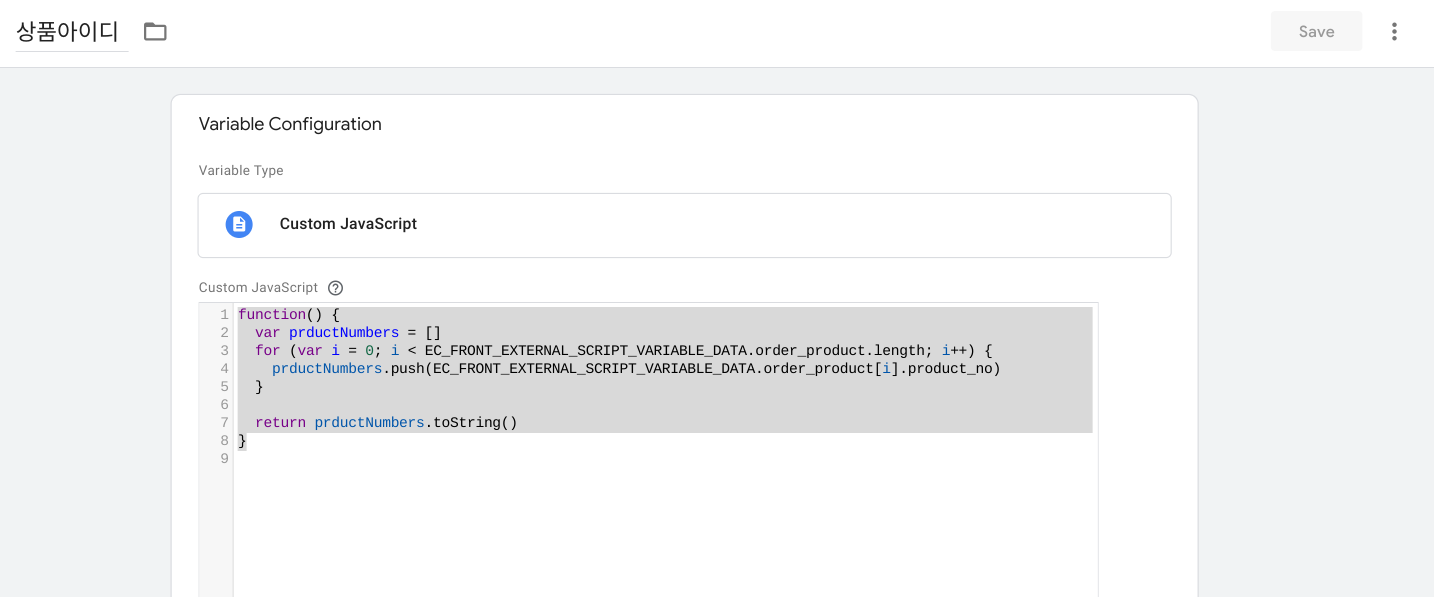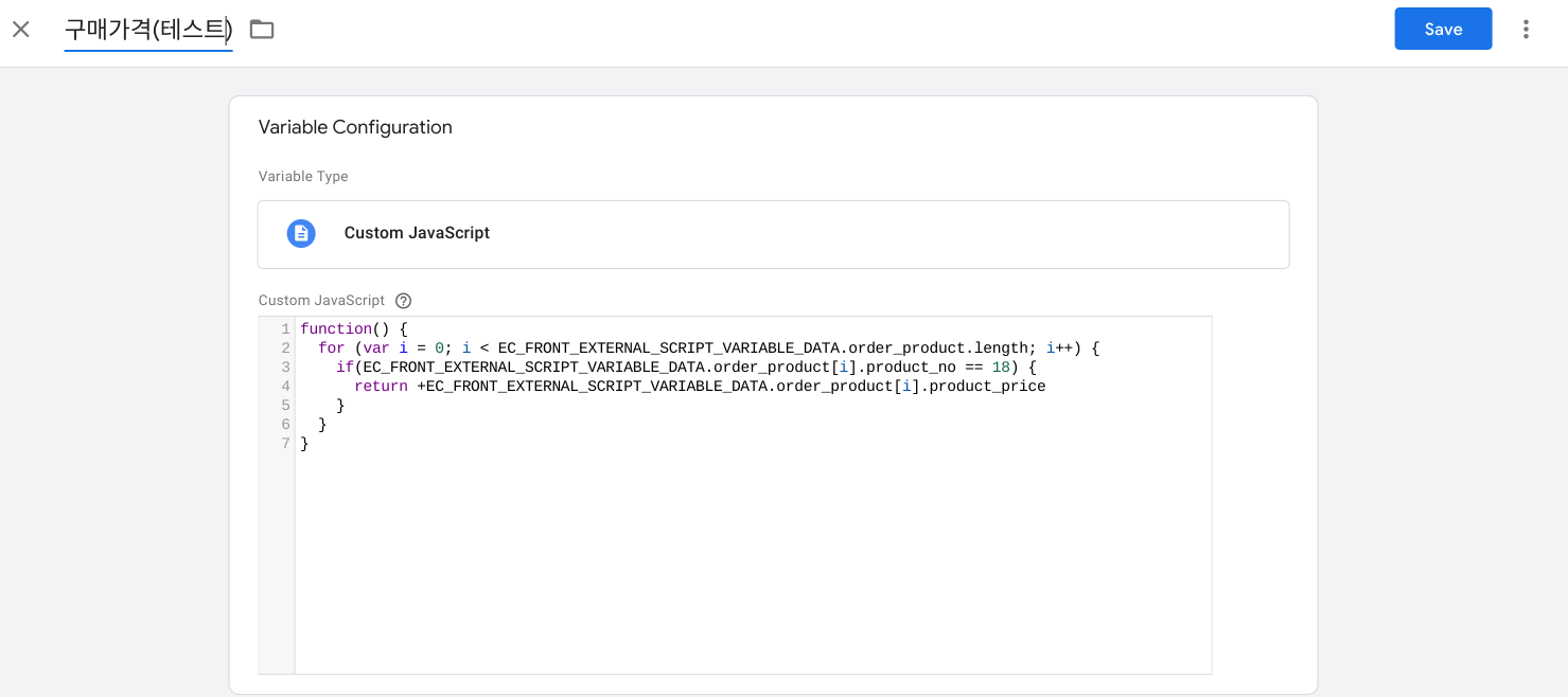 상품별로 가격변수가 생성되어야 하므로 구분이 가능하도록 이름을 지어주고 '저장'을 누릅니다.