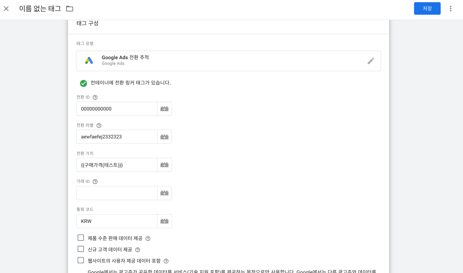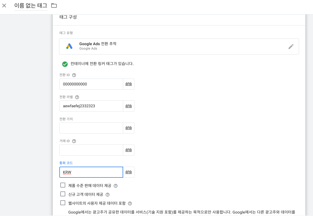 구매 태그 안에 입력해야 하는 값은 '전환 ID'과 '전환 라벨', 통화와 가치가 있으며 먼저, 구글애즈에서 설정한 전환액션의 '전환 ID'과 '전환 라벨' 입력합니다.
