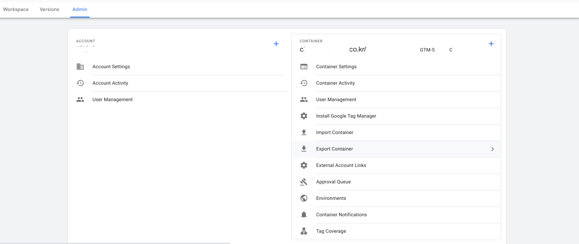 태그가 설치된 태그관리자 로그인 -> '관리자' -> 컨테이너 항목에서 'Export Container'를 선택합니다.