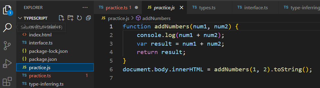 업데이트된 자바스크파일을 확인 가능합니다. 보이는 것처럼 컴파일 과정에서 설정한 타입은 브라우저가 인식가능한 자바스크립트(ECMAScript) 파일로 변환하는 과정에서 다 사라집니다.