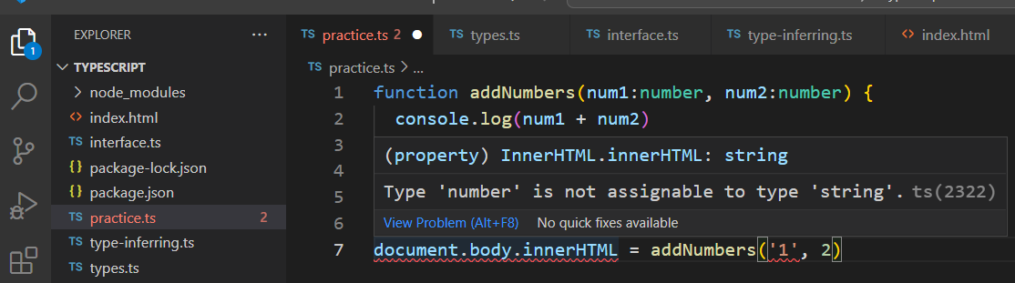 타입을 추가하면 아래와 같이 문자를 사용하는 것이 불가능하는 경고 메시지를 확인가능합니다. 먼저, 타입스크립트가 정말 타입체크 기능만 하는지 테스트해 보죠. 경고를 무시하고 컴파일을 해봅니다.