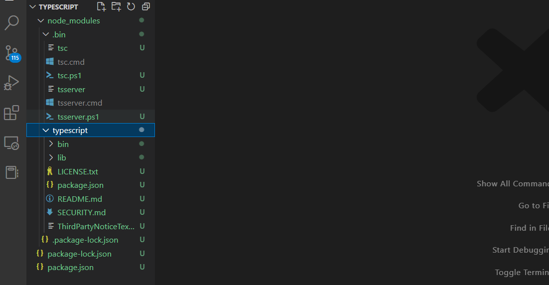 패키지 매니저 (npm, yarm, pmpm)를 통해 타입스크립트를 설치하여 사용하는 것도 가능한데요. 폴더를 생성하고 해당 폴더를 편집기를 통해 열고 커맨드라인 아래와 같이 명령어를 입력하여 타입스크립트를 설치합니다.