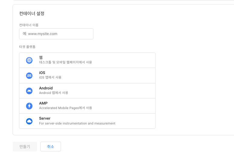 컨테이너 설정 후 '만들기' (컨테이너 이름 - 웹사이트 단위, 타깃 플랫폼 선택)