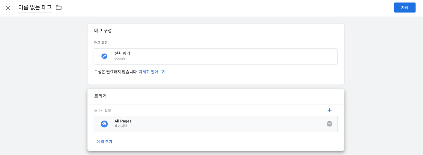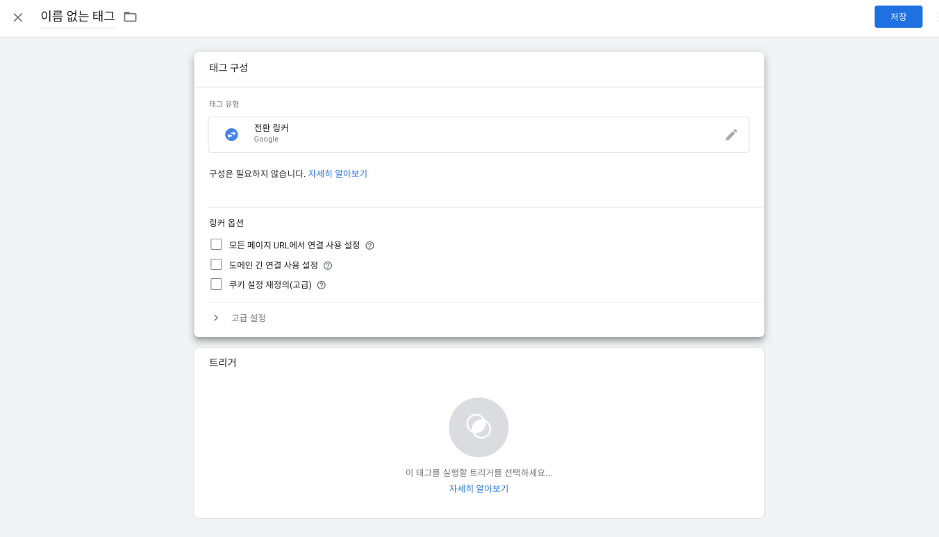 열린 화면에서 다른 설정은 필요 없고 '저장'을 선택하면 전환링커 생성이 완료됩니다.