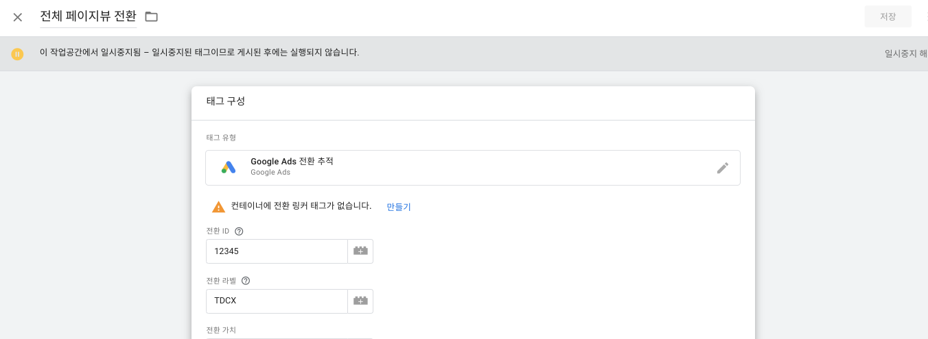 열린 화면에서 구성태그 박스를 선택하면(전환링커가 존재하지 않는 경우) 아래와 같이 '컨테이너에 전환 링커 태그가 없습니다.'라는 경고가 뜨는데 '만들기'를 선택합니다.