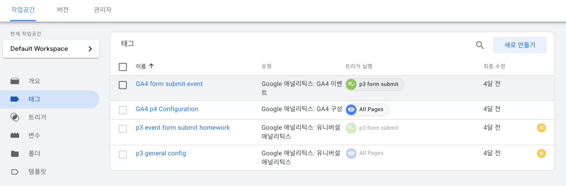 태그관리자 계정에서 '작업공간' -> '태그' -> '새로 만들기' 선택