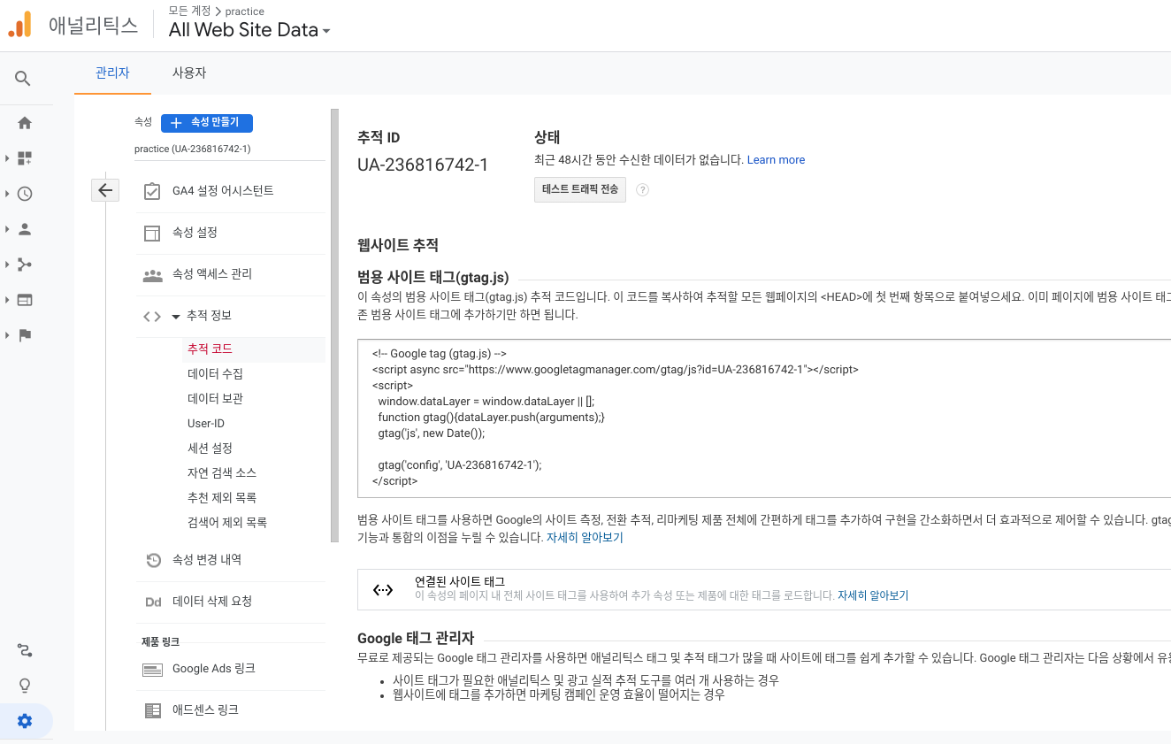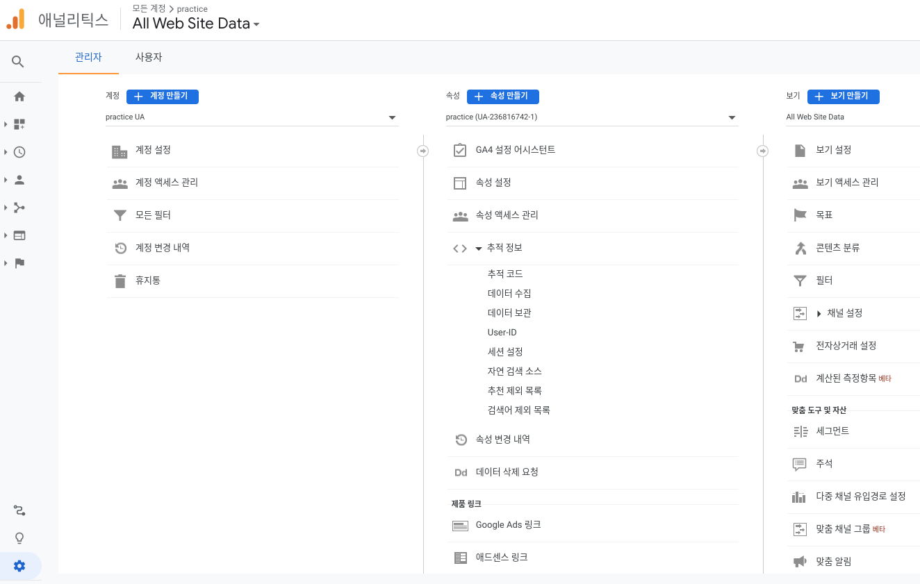 UA 계정에서 좌측 하단에 '관리' -> 속성 항목에 '추적정보' 선택