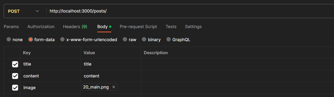 포스트맨을 통해 테스트를 해 보겠습니다. POST요청 바디에 폼데이터를 추가하고 전송 (키 반드시 입력! -> 입력칸이 보이지 않는 경우 테이블을 드래그해서 입력 테이블 크기를 키우면 됩니다)