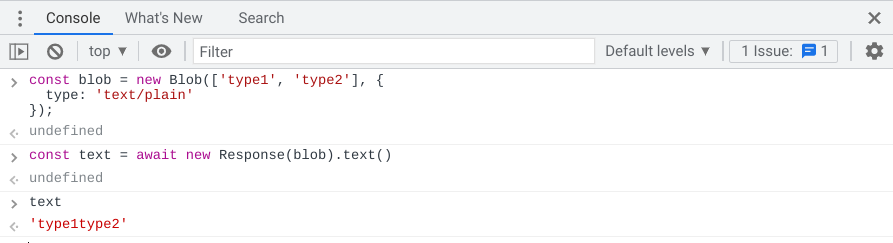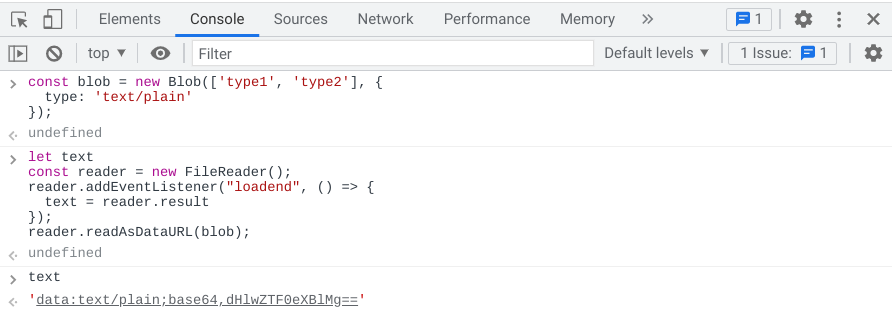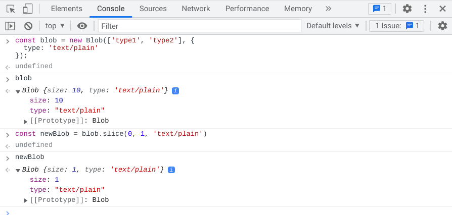 생성된 Blob 객체는 아래와 같은데요. 기본적으로 size와 type (mime type) 속성을 가지는 것을 확인할 수 있습니다.