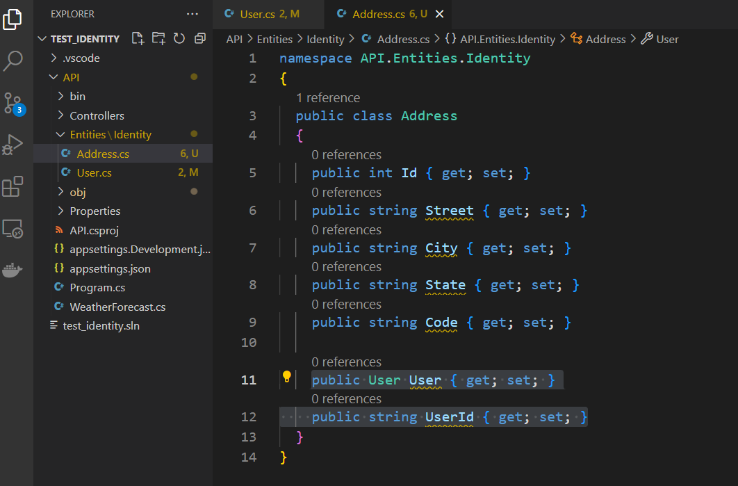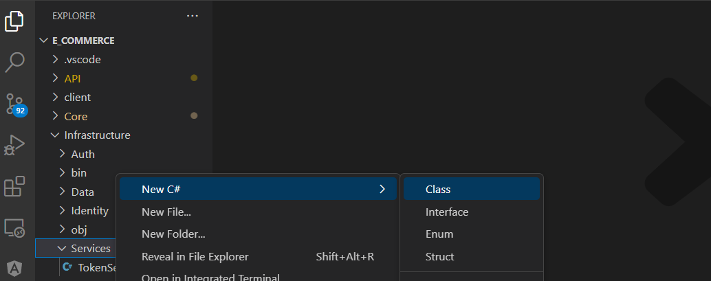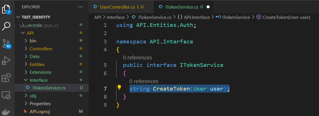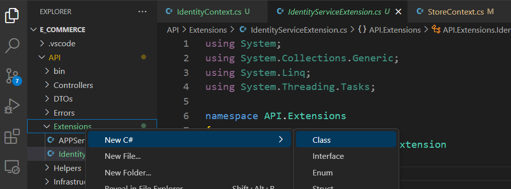 정리를 위해 에이피아이 폴더에 아이덴티티 서비스를 추가할 클래스를 생성합니다 (생성한 클래스 파일을 Program.cs에 연결)