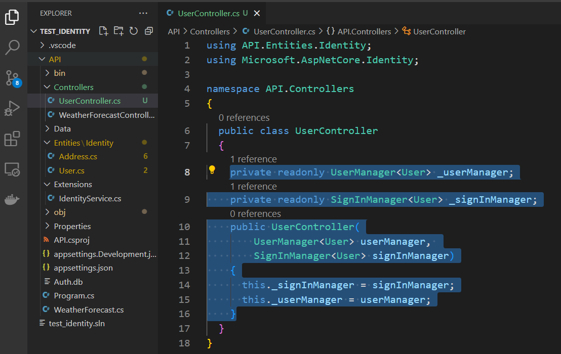 컨스트럭터를 추가하고 사용자 정보를 가져오는 데 사용되는 'UserManager'와 로그인에 필요한 사용자 정보가 맞는지 비교하기 위한 'SignInManager'를 인젝션 합니다
